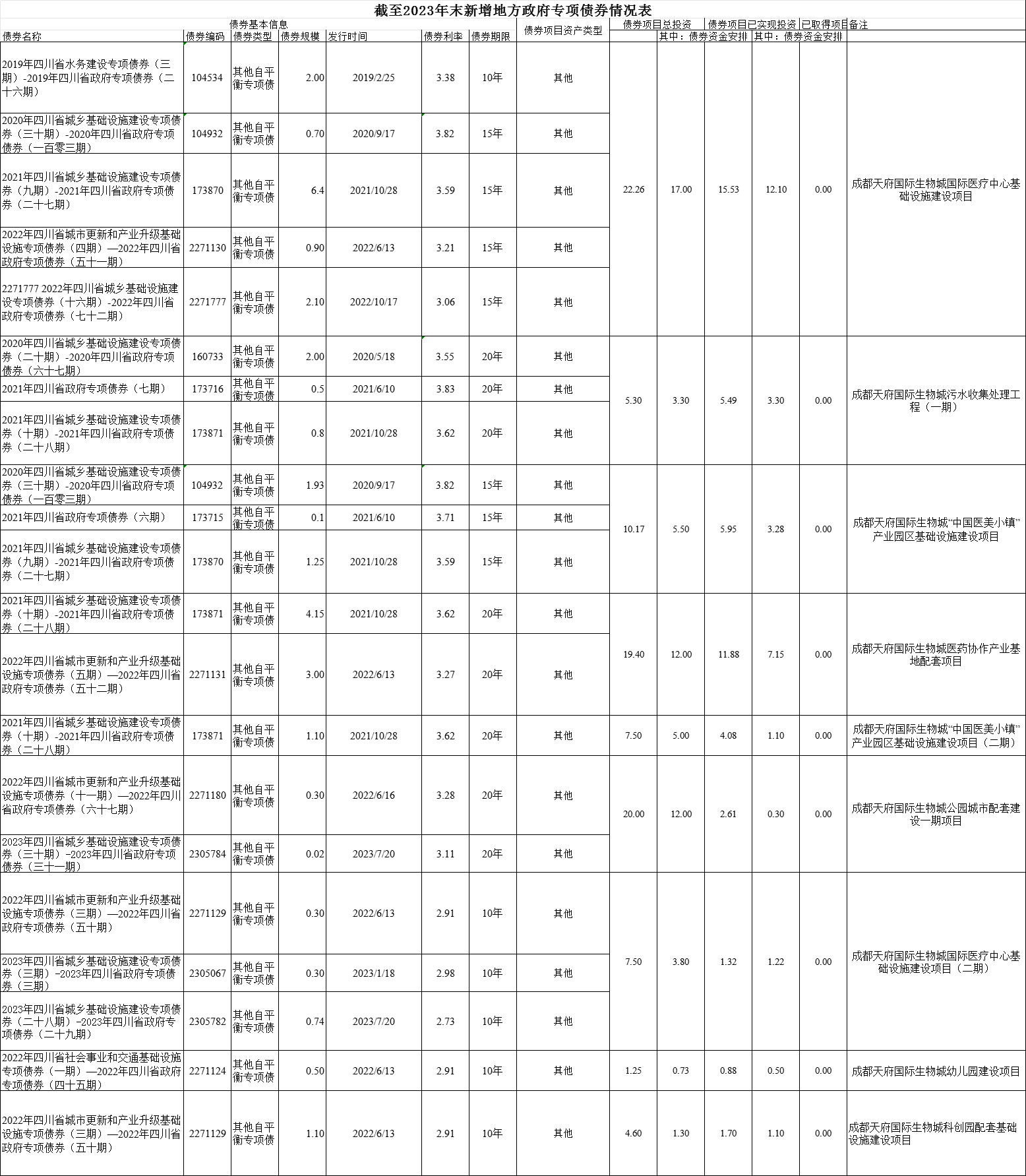 2023年成都天府國(guó)際生物城發(fā)展集團(tuán)有限公司新增地方政府專項(xiàng)債券情況